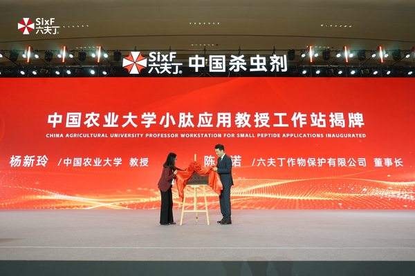 大会现场还举行了中国农业大学小肽应用教授工作站揭牌仪式,该工作站在国内是首家建立,中国农业大学杨新玲教授与六夫丁董事长陈诺共同为工作站揭牌。杨新玲教授介绍:“小肽技术在农业领域的应用具有革命性意义,能够激活作物自身防御系统,提升抗逆性与病虫害抵抗力,工作站将聚焦小肽生物农药的研发优化、田间试验与成果转化,做‘接地气的科研’,让实验室成果真正变成农民手中的‘增收利器’。”此次校企合作将搭建“需求挖掘-联合攻关-技术推广”的全链条创新平台,预计三年内实现3-5项小肽类新型农药的产业化,为农资行业技术升级提供示范样本。