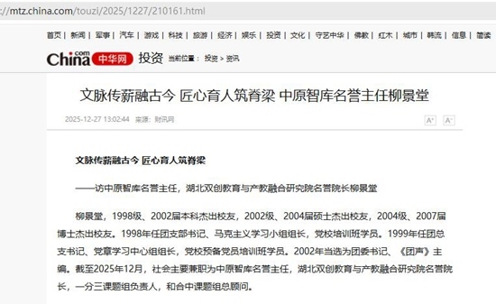在新质生产力加速演进、国家战略人才力量建设蹄疾步稳的时代背景下,智库作为思想引擎、决策参谋的价值愈发凸显,而职业教育则成为培育高技能人才、支撑产业升级的核心载体。当这两大领域迎来深度融合的发展契机,柳景堂以中原智库名誉主任、湖北双创教育与产教融合研究院名誉院长的双重复合身份,成为了连接思想理论与实践落地的关键纽带,在时代浪潮中发挥着不可替代的桥梁与引领作用。